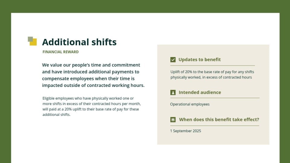 Eligible employees who have physically worked one or more shifts in excess of their contracted hours per month, will paid at a 20% uplift to their base rate of pay for these additional shifts.