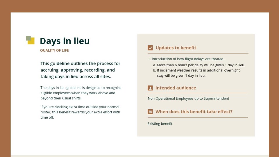 The days in lieu guideline is designed to recognise eligible employees when they work above and beyond their usual shifts.