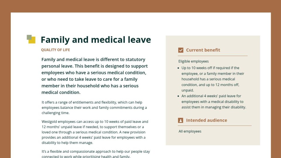Westgold employees can access up to 10 weeks of paid leave and 12 months' unpaid leave if needed, to support themselves or a loved one through a serious medical condition. A new provision provides an additional 4 weeks' paid leave for employees with a disability to help them manage.