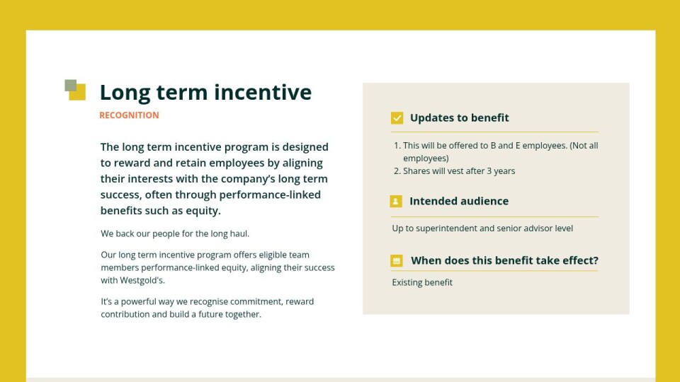 Our long term incentive program offers eligible team members performance-linked equity, aligning their success with Westgold's.