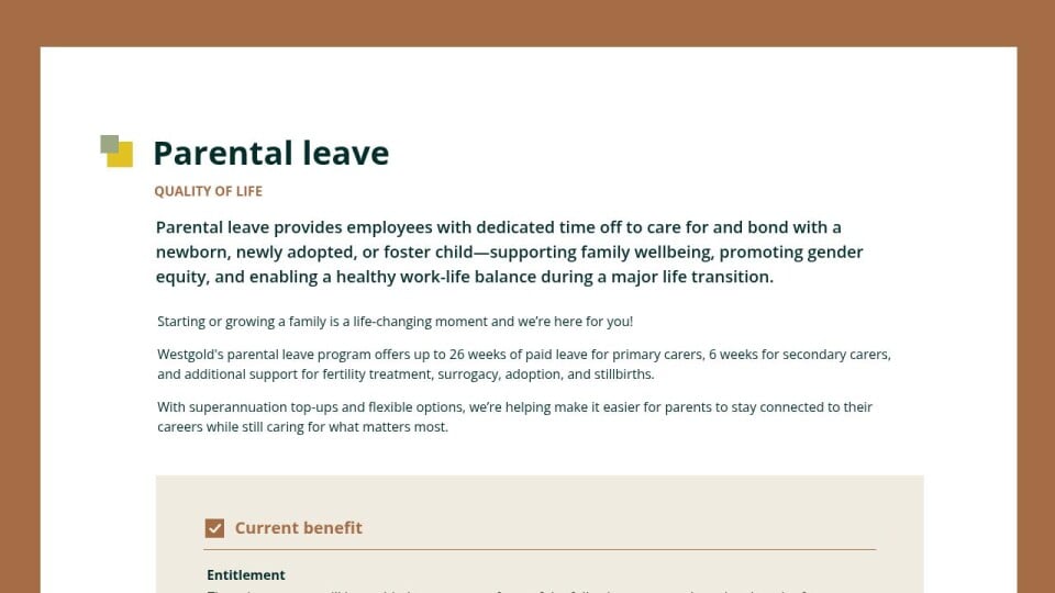 Westgold's parental leave program offers up to 26 weeks of paid leave for primary carers, 6 weeks for secondary carers, and additional support for fertility treatment, surrogacy, adoption, and stillbirths.