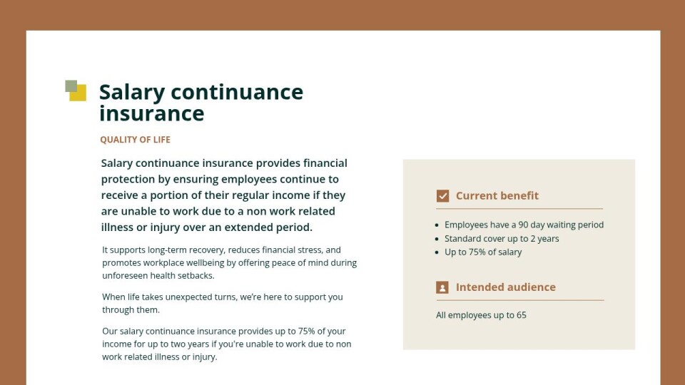 Salary continuance insurance provides financial protection by ensuring employees continue to receive a portion of their regular income if they are unable to work due to a non work related illness or injury over an extended period.