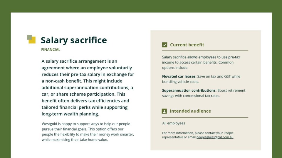 Westgold is happy to support ways to help our people pursue their financial goals. This option offers our people the flexibility to make their money work smarter, while maximising their take-home value.