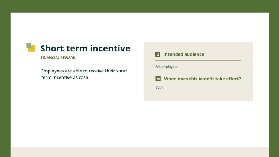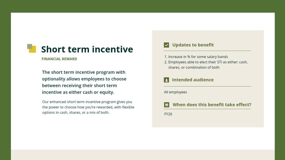 Our enhanced short term incentive program gives you the power to choose how you’re rewarded, with flexible options in cash, shares, or a mix of both.