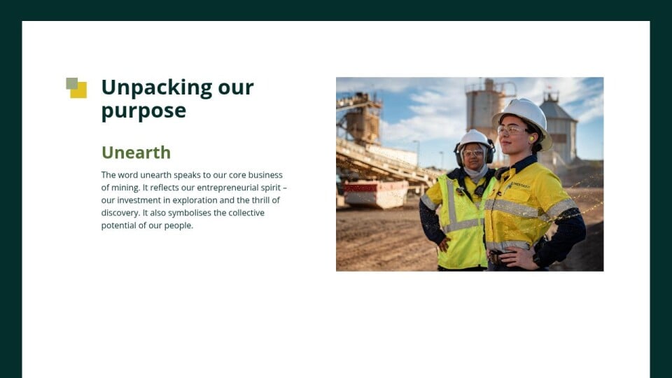 The word unearth speaks to our core business of mining. It reflects our entrepreneurial spirit – our investment in exploration and the thrill of discovery. It also symbolises the collective potential of our people.